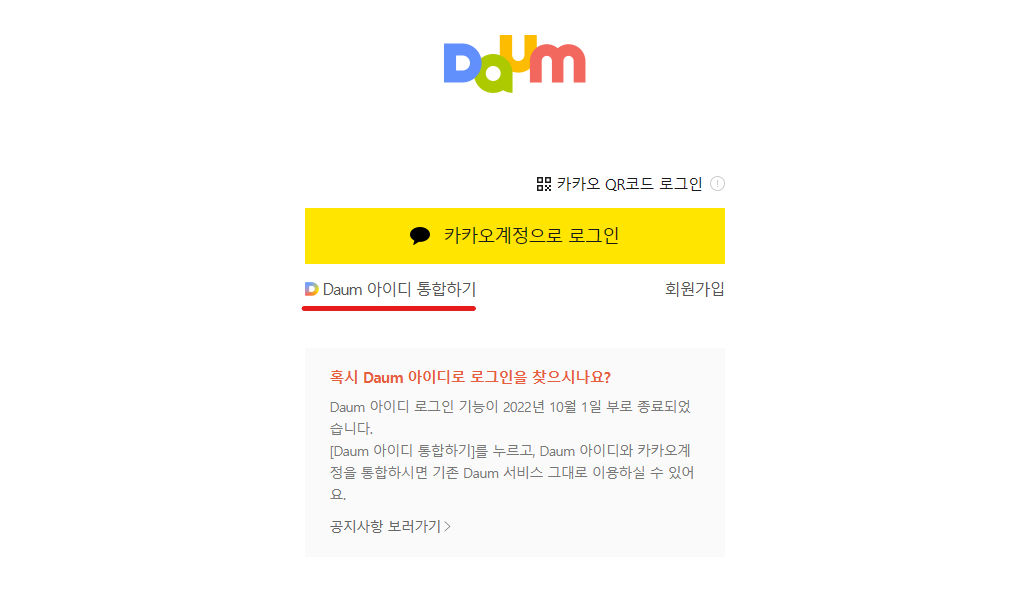 로그인 화면에서 다음아이디와 카카오계정을 통합하시면 기존에 사용하던 다음 서비스를 그대로 이용할 수 있으니 아래의 화면이 나오면 Daum아이디 통합하기를 클릭해서 로그인하시길 바랍니다.